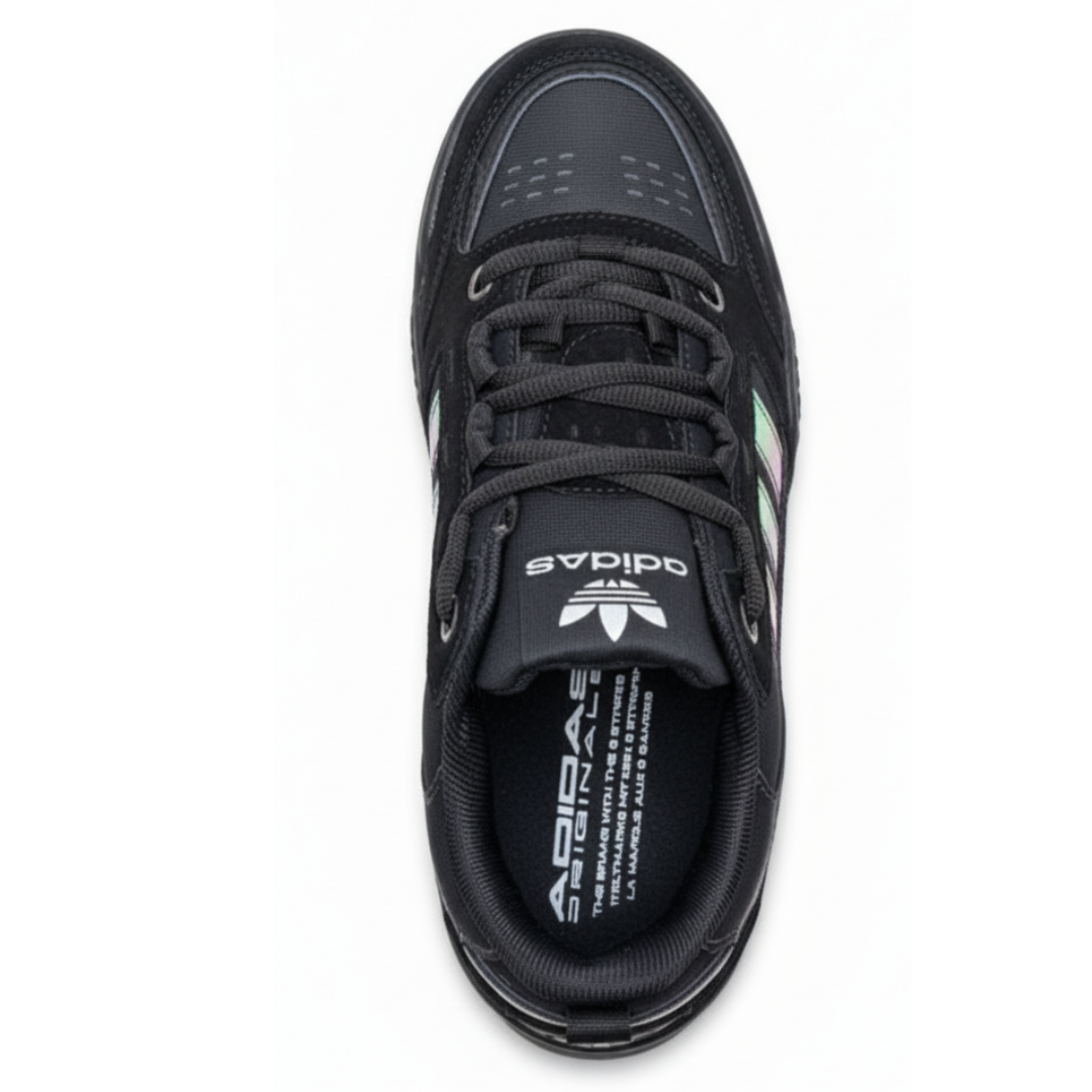 Com seu design volumoso e silhueta marcante, este modelo se destaca. O cabedal, com sobreposições de materiais de alta qualidade como camurça e couro, garante durabilidade e um visual premium. As icônicas três listras da Adidas são reinventadas com um efeito holográfico, adicionando um toque moderno e único.