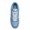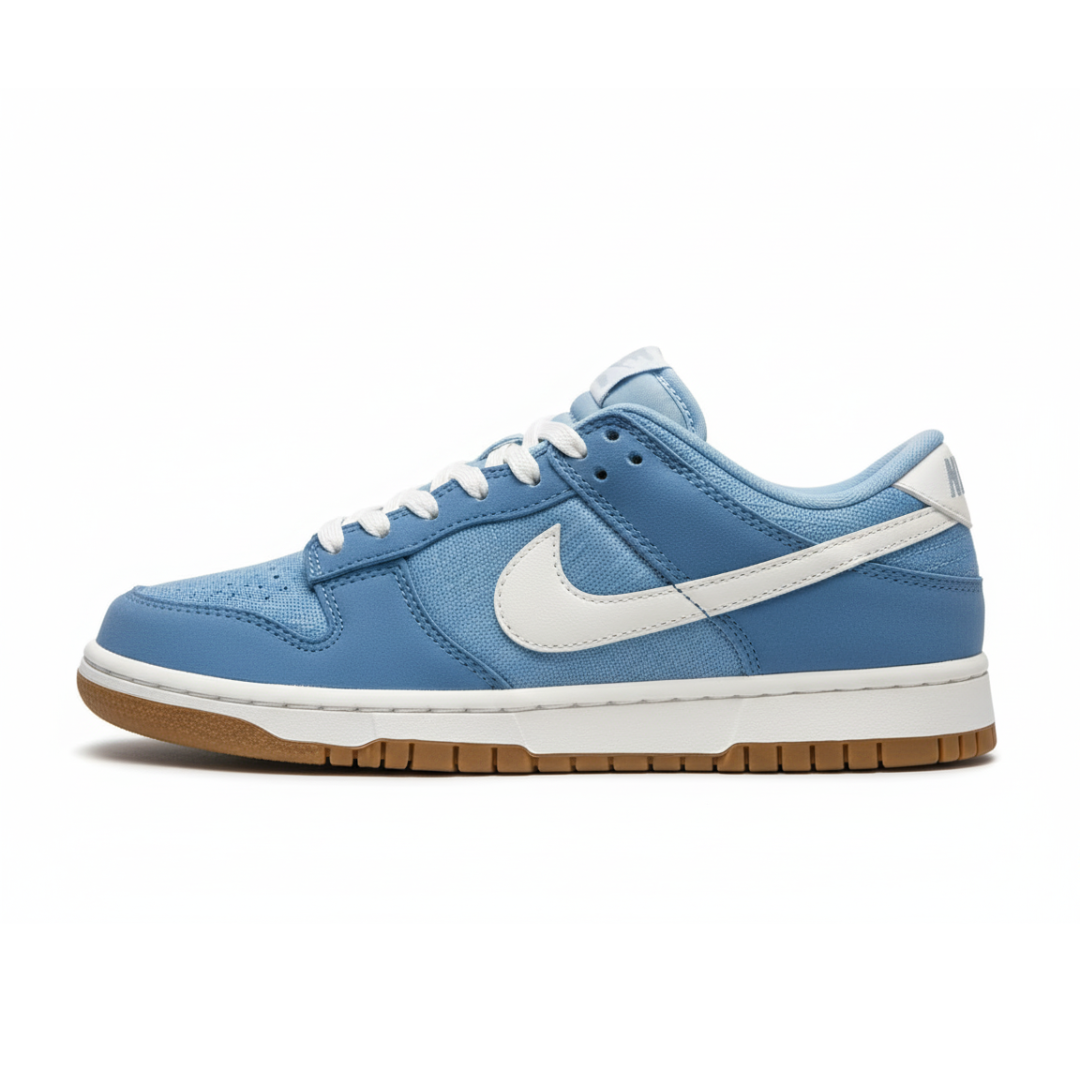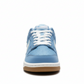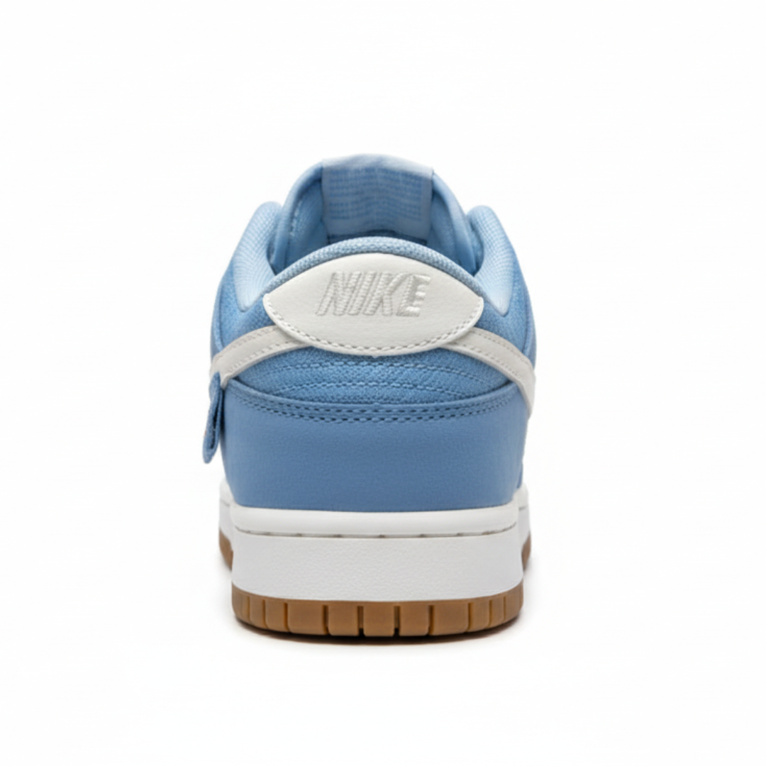 Confeccionado em camurça premium azul claro, este tênis oferece uma textura macia e sofisticada ao toque, garantindo durabilidade e um visual elegante. Os painéis sobrepostos e a biqueira perfurada mantêm a silhueta clássica do Dunk, enquanto o Swoosh lateral em branco leitoso proporciona um contraste suave e destacado.