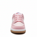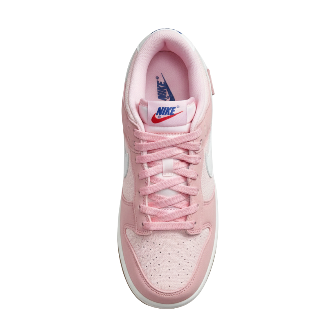A parte superior do tênis é confeccionada em camurça premium na tonalidade rosa blush, evocando a maciez e o conforto de um abraço de urso. Texturas sutis e delicadas adornam a camurça, adicionando profundidade e um toque lúdico ao design. O icônico "Swoosh" da Nike se destaca em um branco imaculado, proporcionando um contraste elegante e reforçando a identidade da marca.